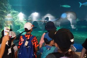 大きなエイや迫力のあるトド、可愛らしいイルカなど、普段見ることのできない海の生き物たちに、みんな興味津々。