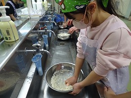最初は説明を聞いて、グループに分かれてお米をとぎます。
