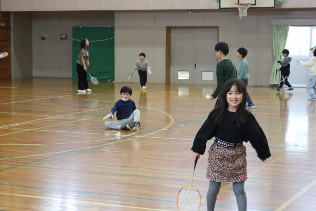 教室では、ラケットなどの道具になれるあそびや、サーブ練習、シャトルを遠くまで飛ばす「クリア」の練習をしました。最初は苦戦する様子も見られましたが、何度も打つうちに少しずつコツをつかみ、シャトルが高く飛ぶと嬉しそうな声があがっていました。