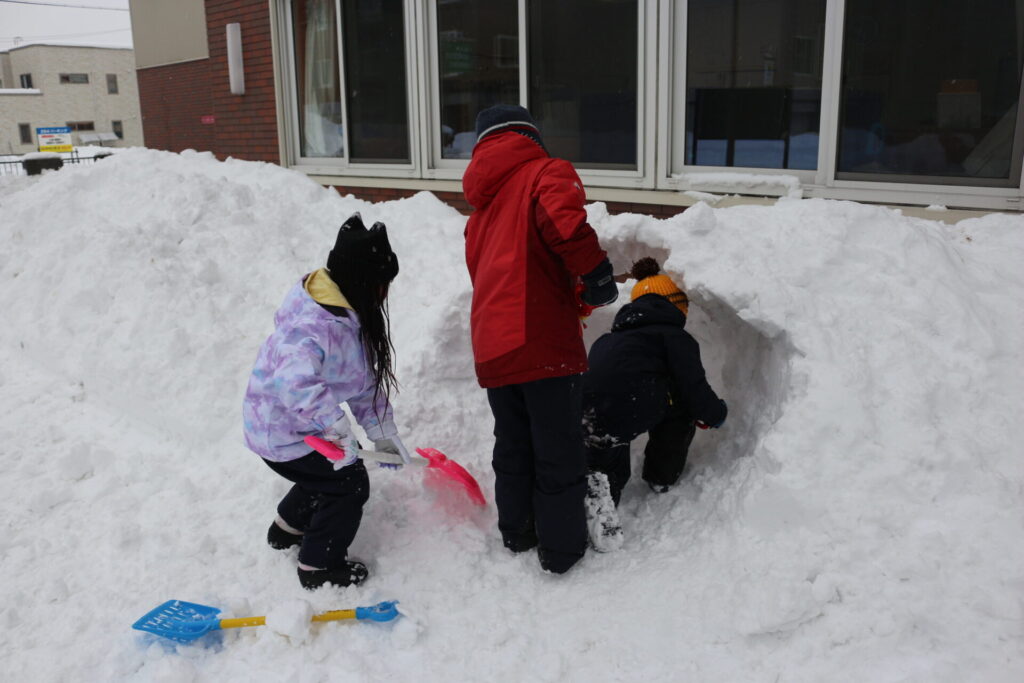 かまくら作りでは、お友だち同士で協力して大きな穴を掘ったり、水を使って固めてみたり熱心に作っていました。