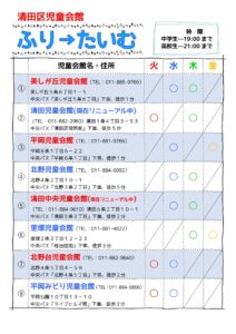 児童会館ではふり→たいむという中高生が夜間児童会館で過ごすことができる日があり、清田区では8つの会館でふり→たいむがあります。