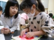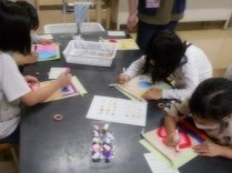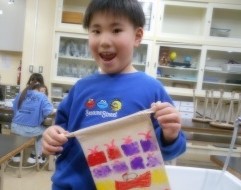 布に絵を描くのは初めてという子もいましたが、思い思いに作品作りを楽しんでいました。細かな作業に苦戦する場面もありましたが、友だち同士で教え合ったり、職員と一緒に工夫したりして、最後まで一生懸命取り組む姿が見られました。