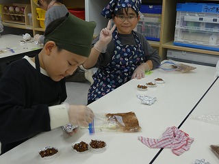 気温が低くチョコレートが固まってしまうなど、なかなかコーンフレークと混ざらず苦戦しながらも、なんとか次の段階へ!