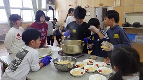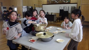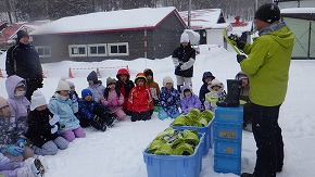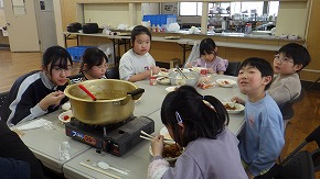 「うちのグループのカレーが一番おいしい!」、「家族にも食べさせてあげたい!」カレーがおいしくて、何度もおかわりをしました。雪遊び後のホットココアも大人気!