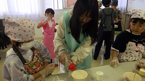 メロンソーダ色のつぶつぶに「きれい!」と歓声をあげながら、盛り付けを楽しみました。