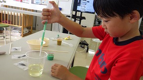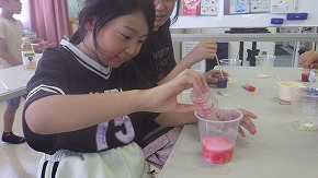 重曹と酢を使って二酸化炭素の発生について実験しました。色とりどりのマグマの動きに歓声が沸きました♪