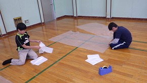 設計図(展開図)を見ながら、大きなビニール袋をひたすらつなげます。