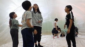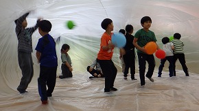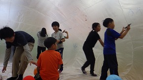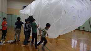 空気をためる工夫をしながら、みごと!宙に浮かび上がった巨大風船に「すごーい!」と歓声がおこりました♪