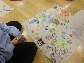 一枚の大きな絵を完成させるグループや、それぞれが好きなキャラクターを自由に描くグループなど