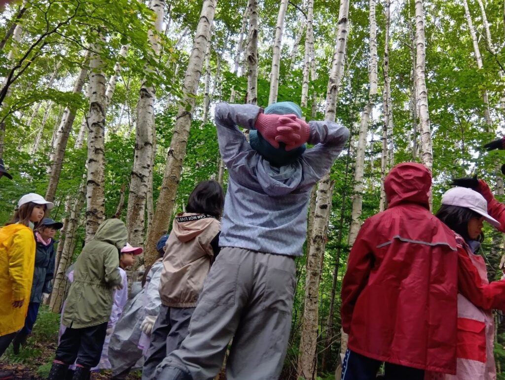 午後の自然散策では、甘い香りがする木の葉っぱやクマゲラが木を突いた痕跡、クマの爪痕を観察することができました。