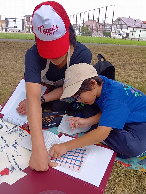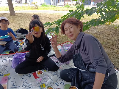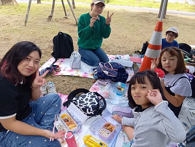 お昼は木の下でお弁当タイム。食べ終わる頃に、なんと雨がポツリポツリ・・・午後のプログラムは児童会館へ移動して行うことに。