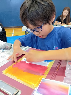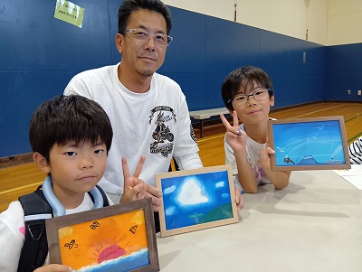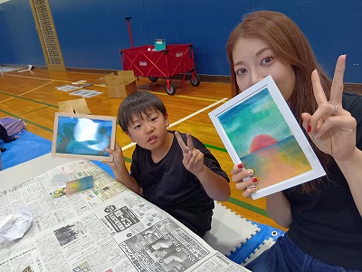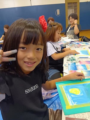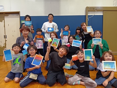 【参加者感想から】 ♪色って無限だなぁってワクワクしました!みんなそれぞれ個性があって、空も色々で色んな色で、とても楽しい時間でした。家に持ち帰れてステキだなぁ、思い出に残ってうれしいです!またこのような機会があれば、参加したいです。 ♪おやこで行けてうれしかったし、オイルパステルでかいて絵がきれいで、いい色でした。またこういうのをしたいです。 ♪いい気もちしました。 ♪たのしいじかんでした。たのしかったことは、色と色をまぜるところです。またやるときもさんかしたいです。 ♪自由に何色を使ってもいいので、普段あまり使わない色も使って楽しかったし、のばすと色の雰囲気がかわるなぁと思った。 ♪きれい!おもしろい!いい時間がとれました。皆の作品を観るのも楽しかったです。 ♪空を描くときは新しい色を入れると違う印象になり、自分でもどのような空になるかわかりませんでした。 ♪ぼくがチョークアートで書いたさくひんはきれいなうみのゆうやけです。むずかしかったところは、太陽が海にしずむところです。たのしかったです。 ♪ぼくは、いろとかぬりえとかきらいだったけどすきになりました。たのしかったです。 |