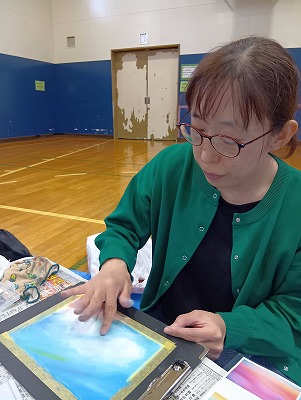 サンプルはいくつか用意したのですが、みなさんはそれを超えた創造力を発揮!心の内から湧き出す感性で思い思いの「空のグラデーション」を描きあげていきます。もうここまできたら迷いなんてありません!みなさんがするすると心地よくオイルパステルを運ばせている姿を見て、こちらも心地よい気分。