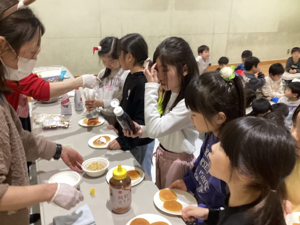 食べ物コーナーではパンケーキに生クリームやフルーツなどでデコレーションをしました。